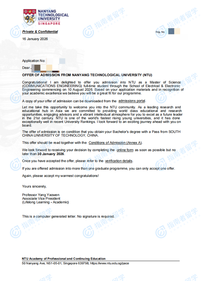 南洋理工大学通信工程理学硕士研究生offer一枚