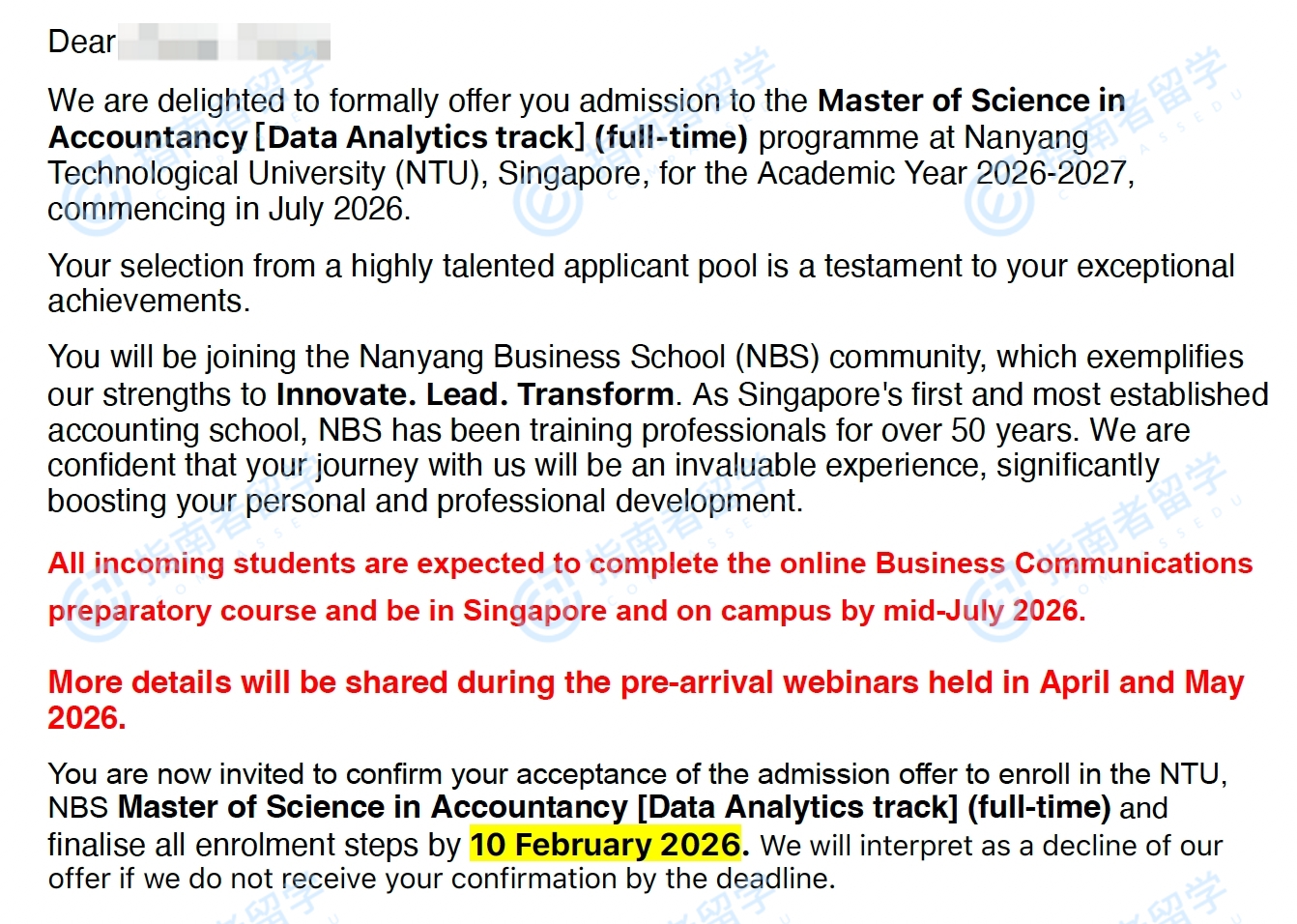 南洋理工大学会计学理学硕士研究生offer一枚
