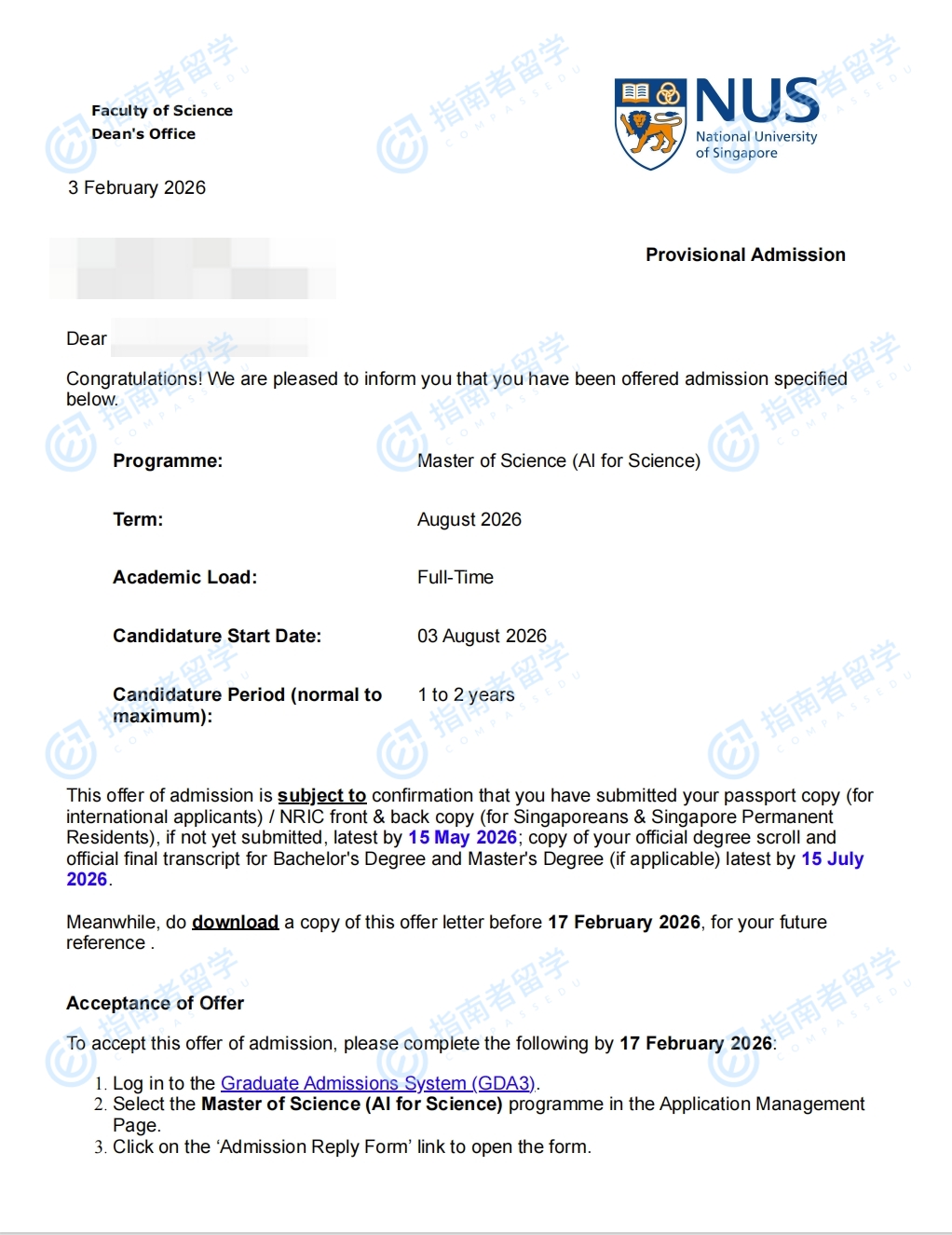 新加坡国立大学科学智能理学硕士研究生offer一枚