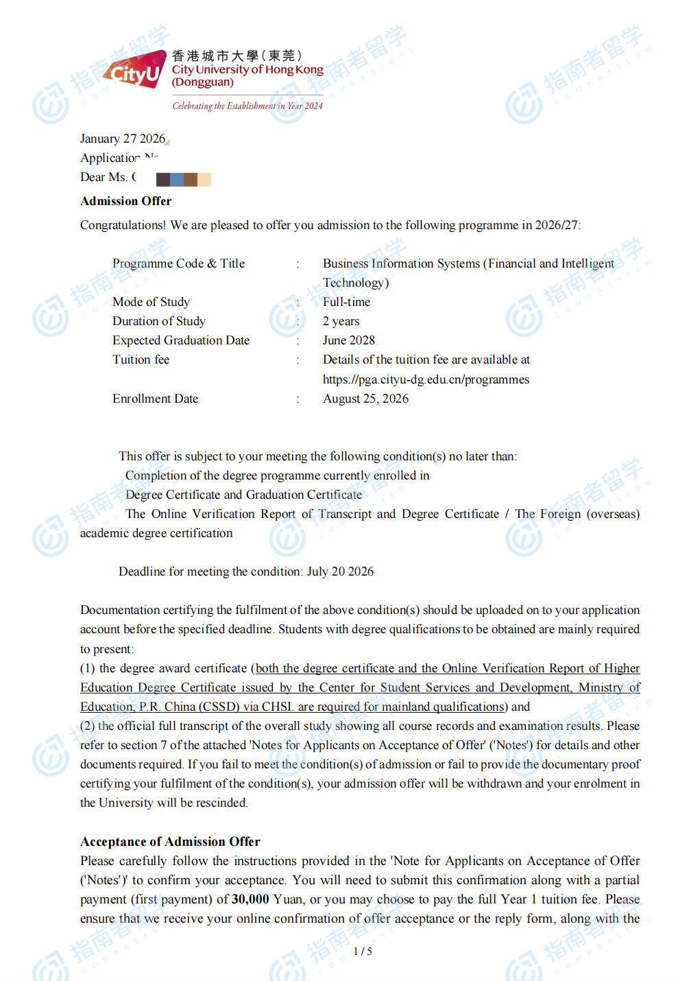 香港城市大学商务资讯系统理学硕士(金融与智能技术)(香港城市大学(东莞)- 复旦大学联合开设)研究生offer一枚