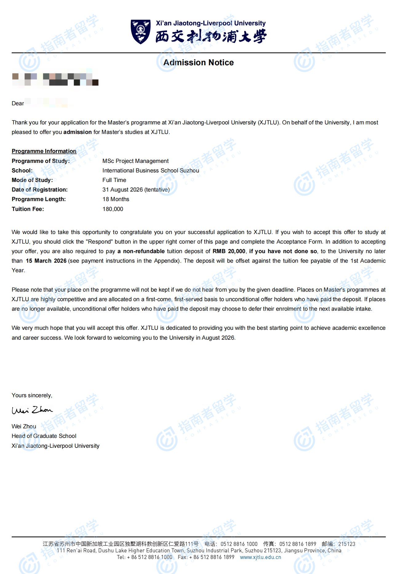 西交利物浦大学项目管理理学硕士研究生offer一枚