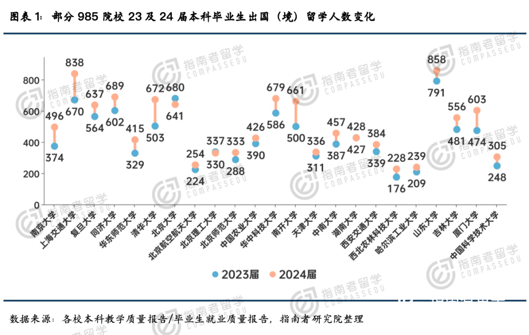咱们看顶尖高校的动向就知道了。在已经公布2023届和2024届本科毕业生去向的985院校里,绝大部分学校的留学人数都在增加。