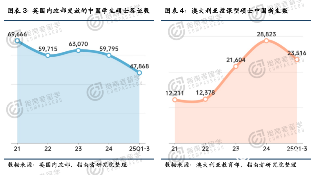 数据显示,截至2025年前三季度,英国给中国学生发的硕士签证少了近20%,澳大利亚的硕士新生里,中国学生也少了21%。