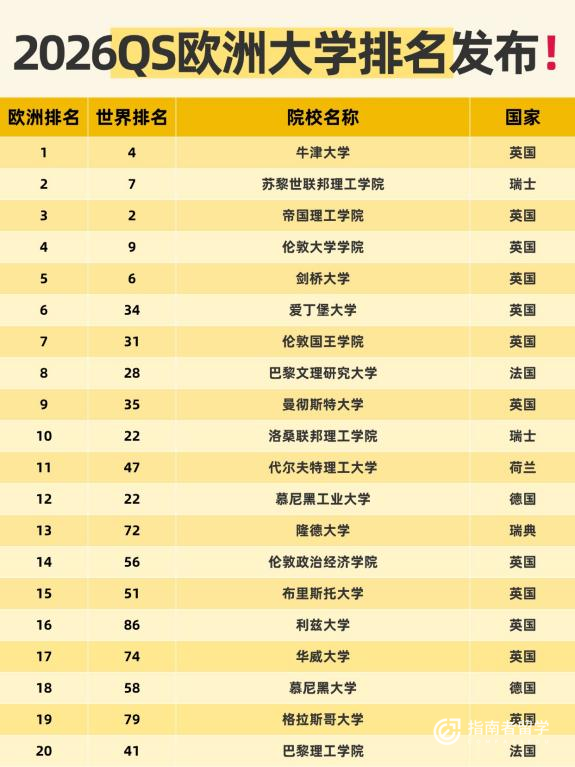 上周,留学圈备受瞩目的QS甩了今年的第一份重磅榜单——2026年QS欧洲大学排名。