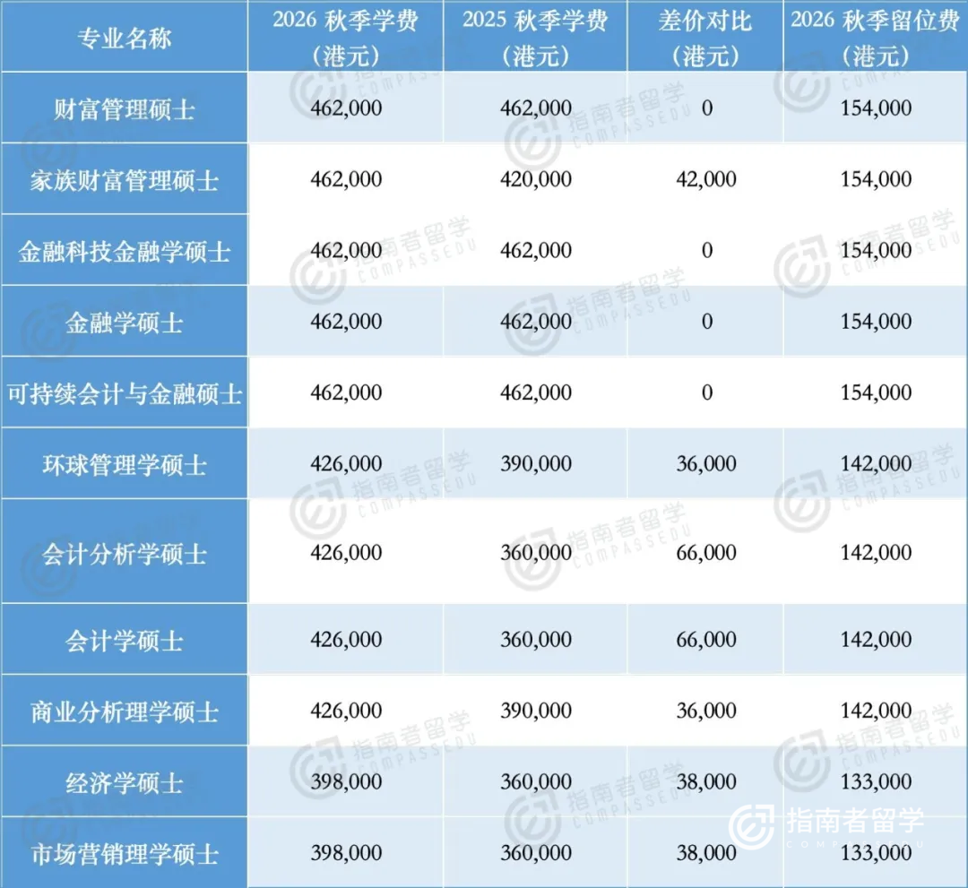 港大商学院的会计学、会计数据分析等项目,26fall学费42.6万港元,对比25fall最高大涨了6.6万港元。