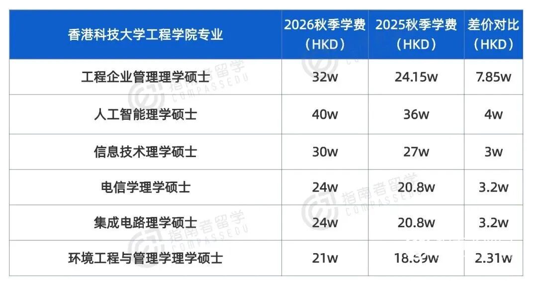 相对亲民的理工科,也在悄悄涨价。港科工程企业管理项目,26fall学费上涨7.85万,涨幅一下子冲到了32%。