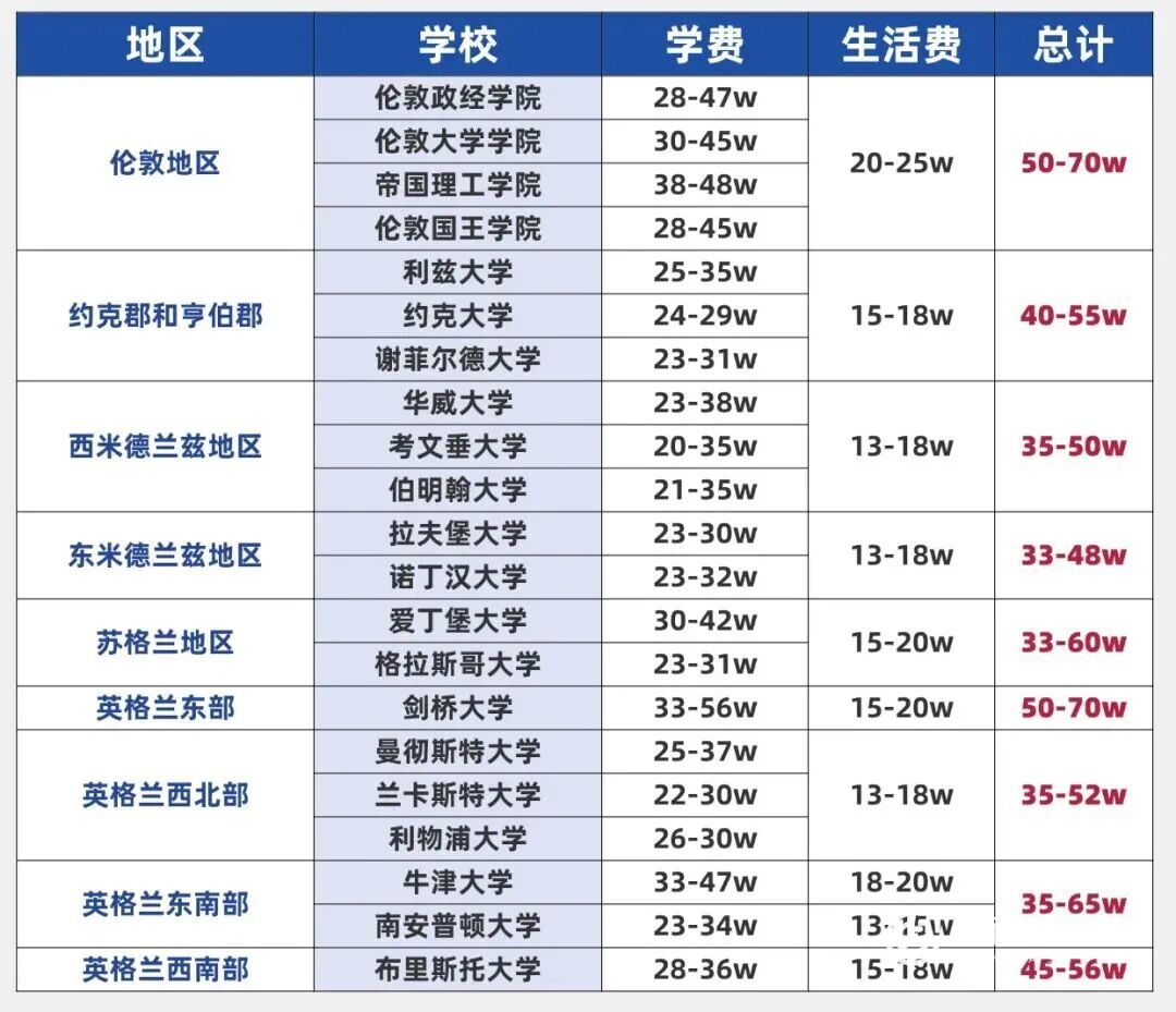 G5名校一年3.5-6万英镑,大约32万-56万人民币,商科最贵能超5万英镑,理工科4万-4.5万英镑,人文社科最友好;普通院校就亲民多了,一年24万-40万人民币能搞定。