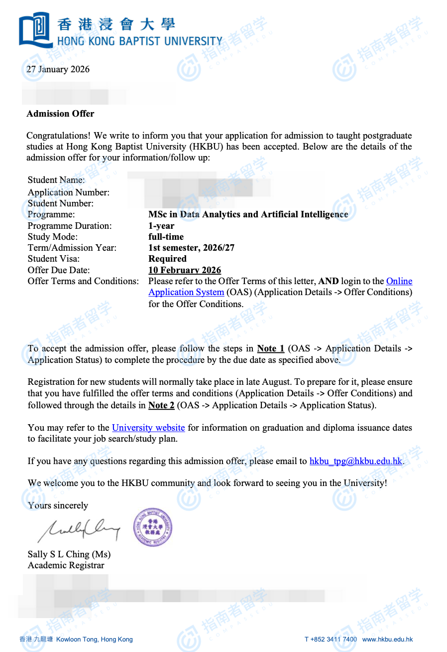 香港浸会大学数据分析与人工智能理学硕士研究生offer一枚