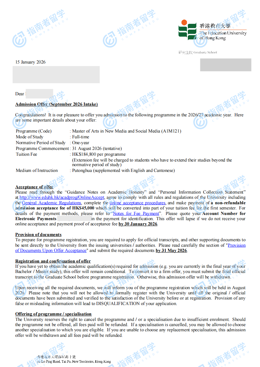 香港教育大学新媒体与社交媒体文学硕士研究生offer一枚