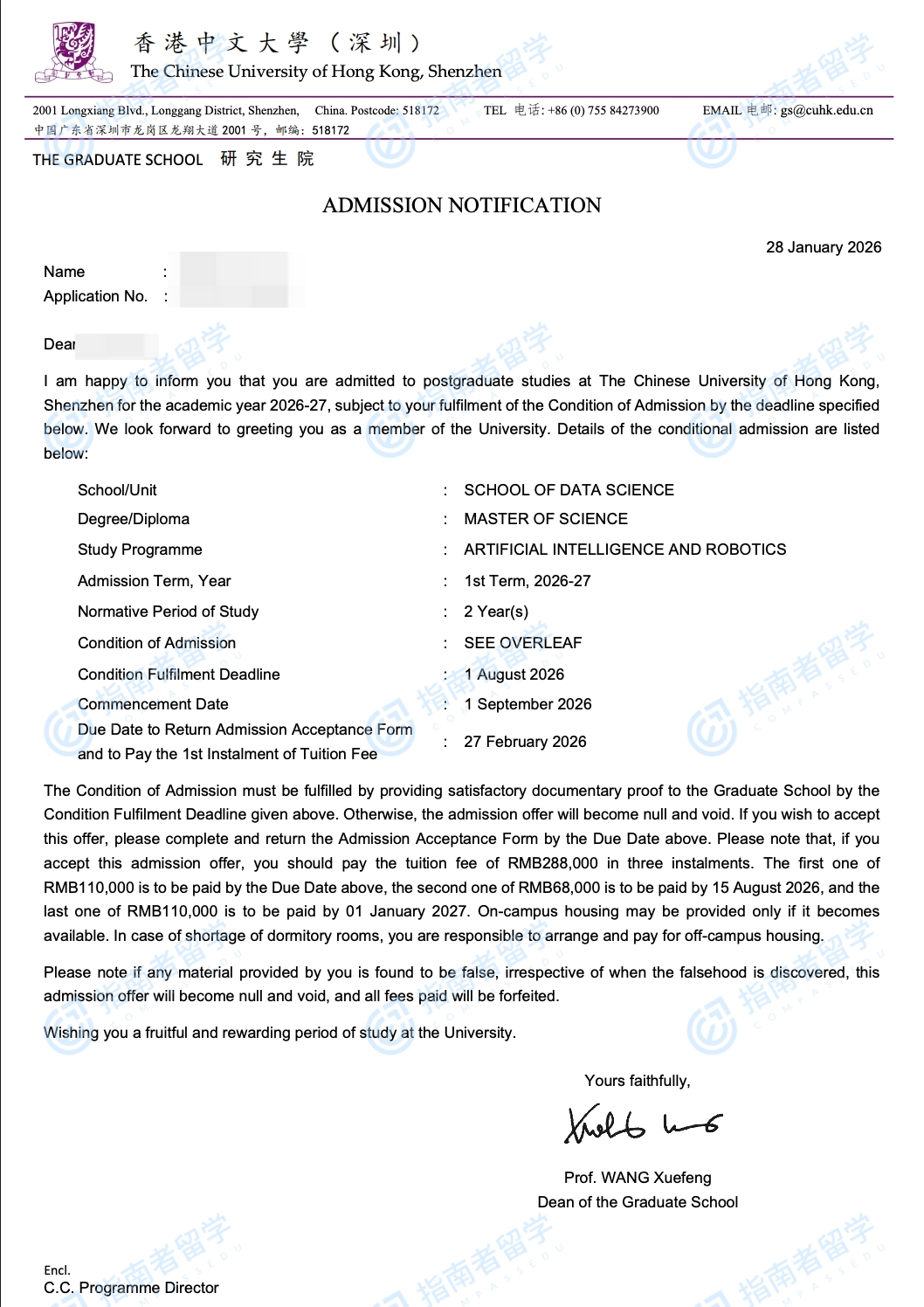 香港中文大学人工智能与机器人理学硕士(CUHK-Shenzhen)研究生offer一枚