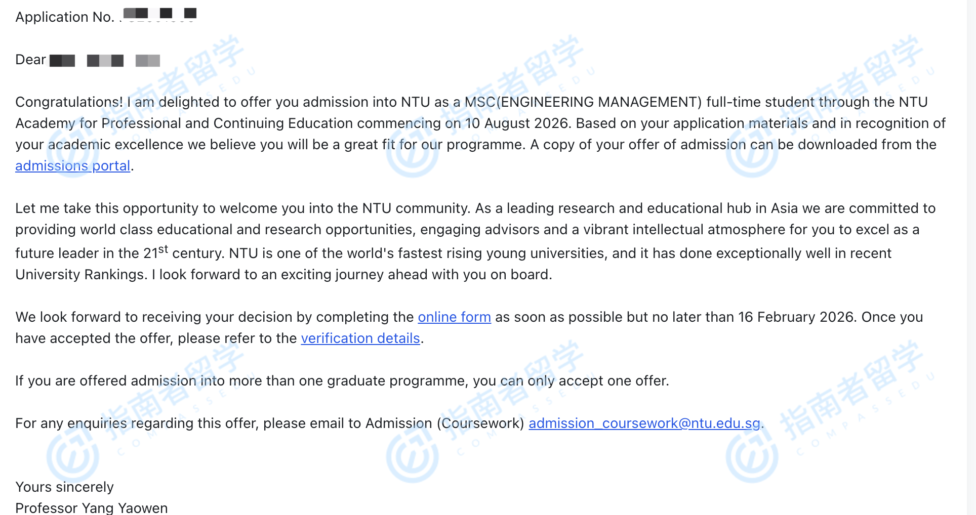 南洋理工大学工程管理理学硕士研究生offer一枚