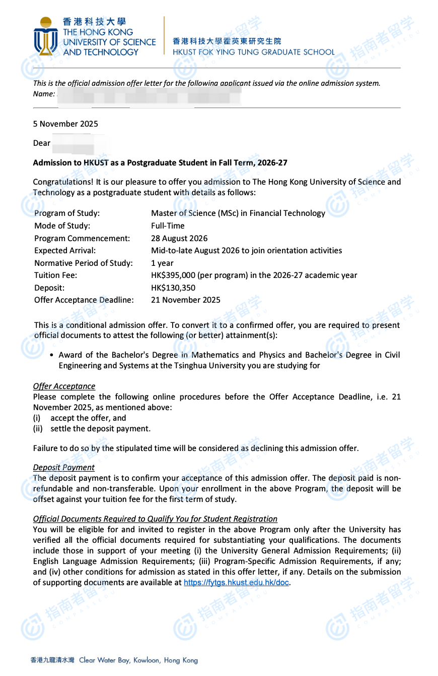 香港科技大学金融科技理学硕士研究生offer一枚