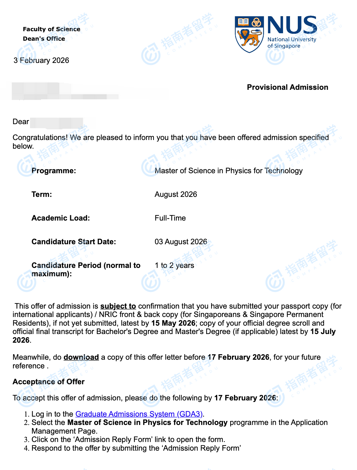 新加坡国立大学技术物理学理学硕士研究生offer一枚
