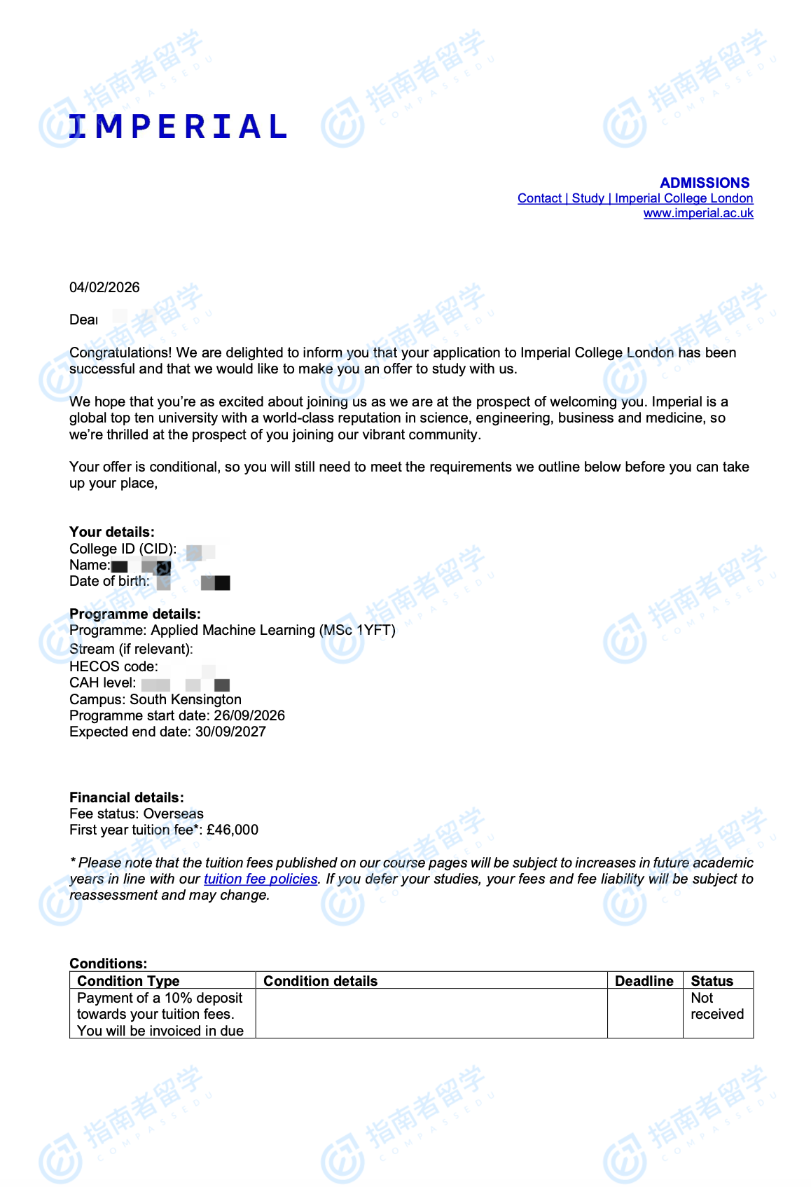 帝国理工学院应用机器学习理学硕士研究生offer一枚
