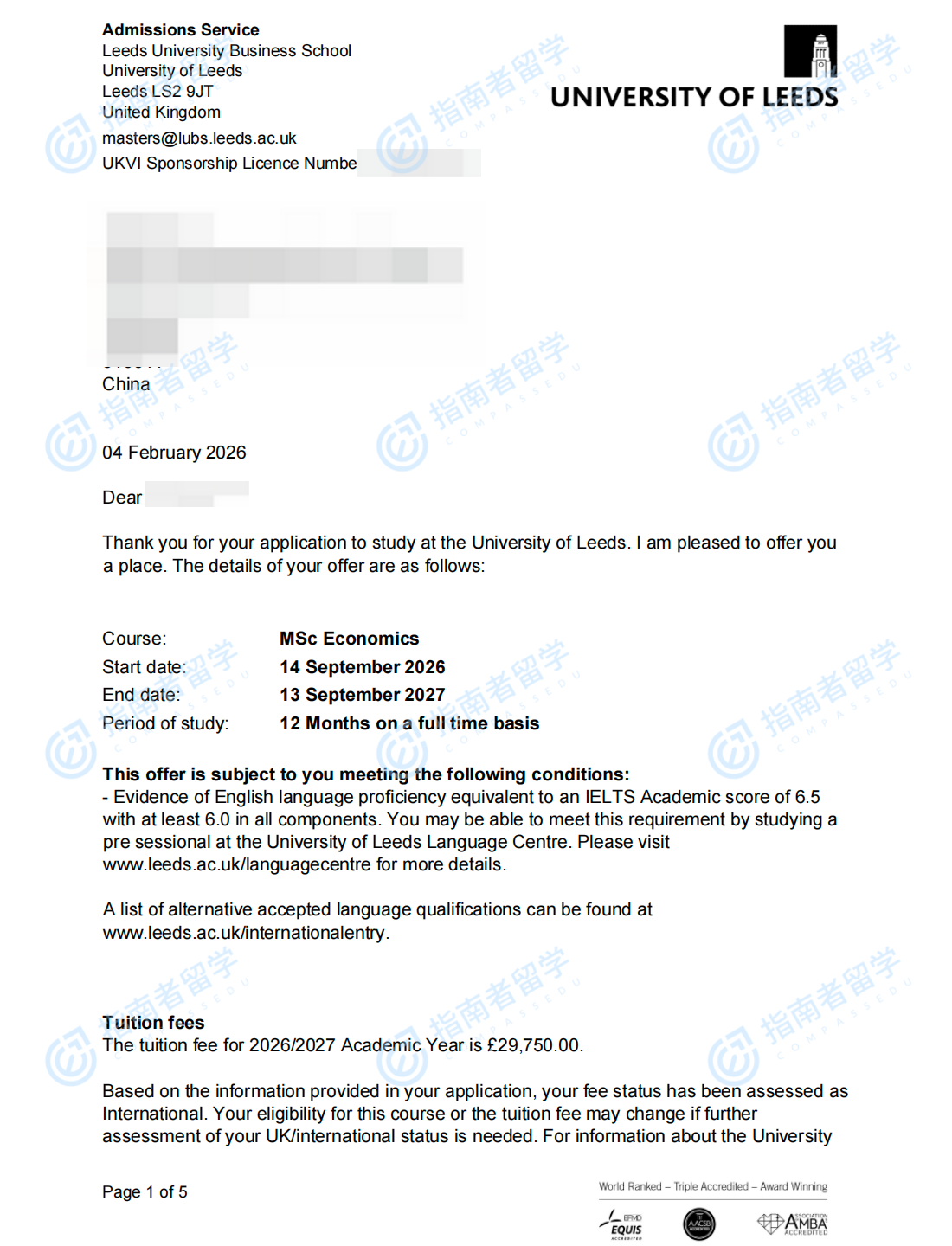 利兹大学经济学理学硕士研究生offer一枚
