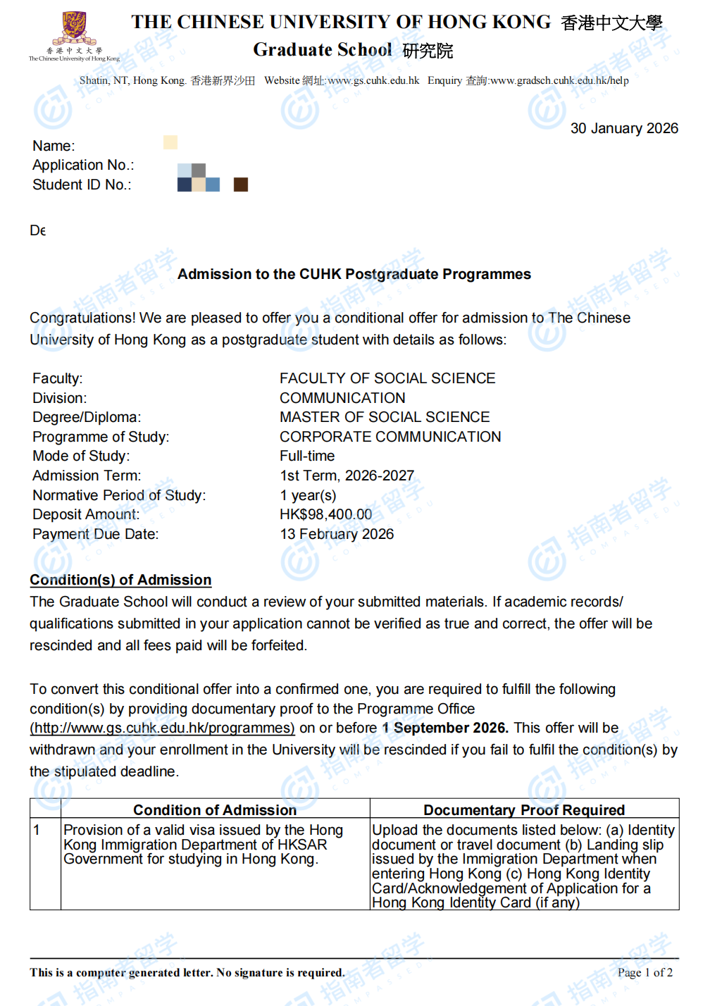香港中文大学企业传播社会科学硕士研究生offer一枚