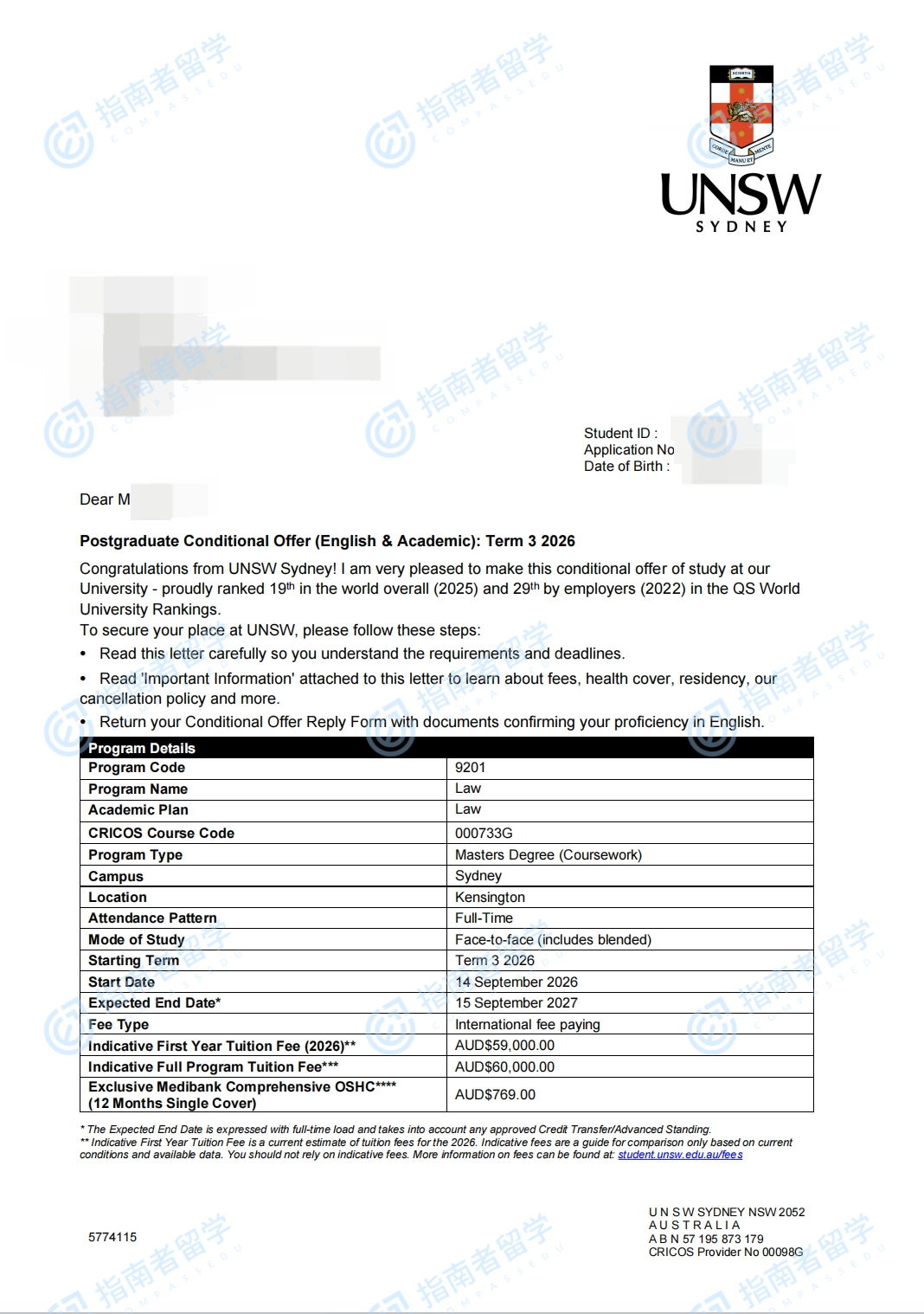 新南威尔士大学法学硕士课程面向法律和非法律专业的毕业生开放,如果申请者通过非法律学位或非普通法国家的法律学位进行申请,需要将必修核心课程纳入课程<br> 要符合法学硕士课程的资格,申请者必须满足以下任何一项条件:<br> 1. 具有新南威尔士大学颁发的法学学士(荣誉)学位,并且达到平均学分,或具有其他大学或高等教育机构颁发的同等学历<br> 2. 具有新南威尔士大学颁发的法学学士学位(LLB),并且达到平均学分,或具有其他大学或高等教育机构颁发的同等学历<br> 3. 具有新南威尔士大学颁发的法学博士学位,并且达到平均学分,或具有其他大学或高等教育机构颁发的同等学历<br> 4. 具有新南威尔士大学颁发的社会科学或人文科学学士学位,并且达到平均学分,或具有其他大学或高等教育机构颁发的同等学历<br> 5. 具有新南威尔士大学颁发的法学博士学位或法律、社会科学或人文学科学士学位,或具有其他大学或高等教育机构颁发的同等学历,具备至少2年相关专业经验<br> 6. 具有新南威尔士大学颁发的学士学位,并且达到平均学分,或具有其他大学或高等教育机构颁发的同等学历,具备至少2年相关专业经验<br> 对于5和6,相关专业经验可以包括:作为当地政府官员获得的法律和政策问题方面的专业经验;就法律和政策问题提供咨询;州或联邦政府机构负责法律和政策问题的官员/经理或类似职位;公司审计、监督或管理法律和政策问题;以法律或政策为重点的项目管理;负责法律或政策改革的非政府组织或国际组织<br> 请注意:有兴趣学习本课程的非211中国大学的申请者必须在其当前大学的评分系统中至少达到总体平均成绩80分,使用新南威尔士大学研究生课程入学分数计算器计算相当于75%的平均分